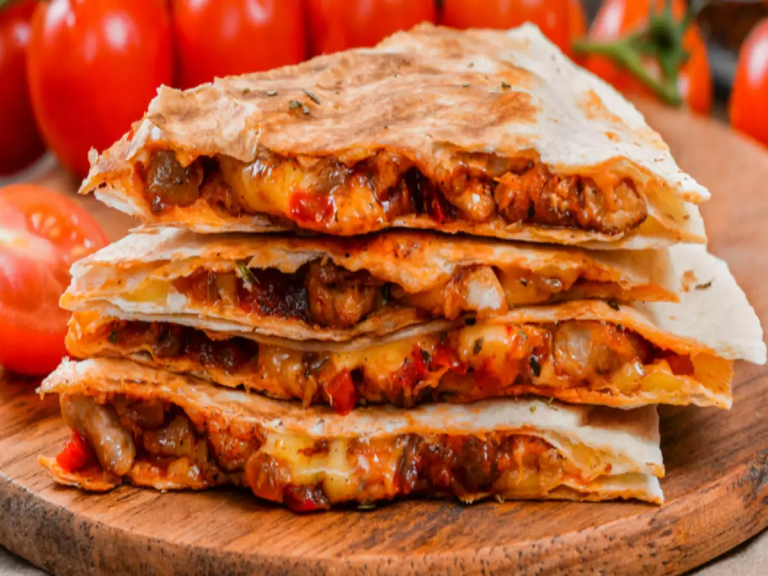 Succulent pieces of tender chicken, marinated in smoky chipotle sauce, nestled between layers of melted cheese and grilled tortillas, creating a harmonious blend of Savory Flavors with a hint of heat.